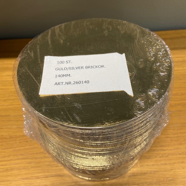 Hem » Webshop » Tillbehör » Emballage/påsar » PP 102508 BRICKA GULD/SILVER 140 MM 100 ST